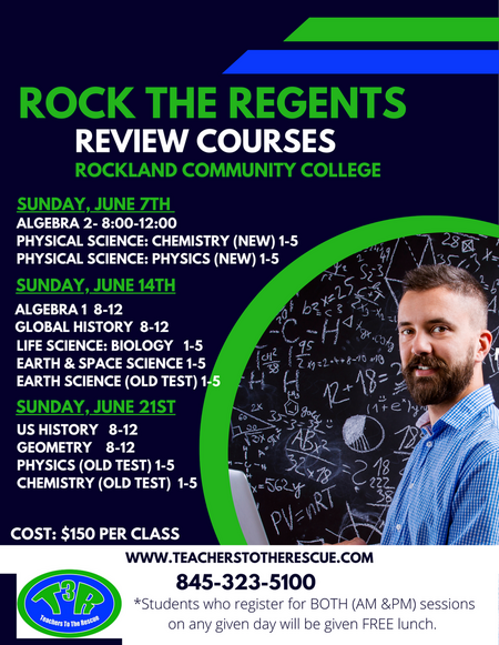 Thank you for registering your child for our Rock the Regents 2025 Review Courses! You will receive a confirmation email with payment information within 24-48 hours. Thank you! If you have any questions please give us a call at 845-323-5100.